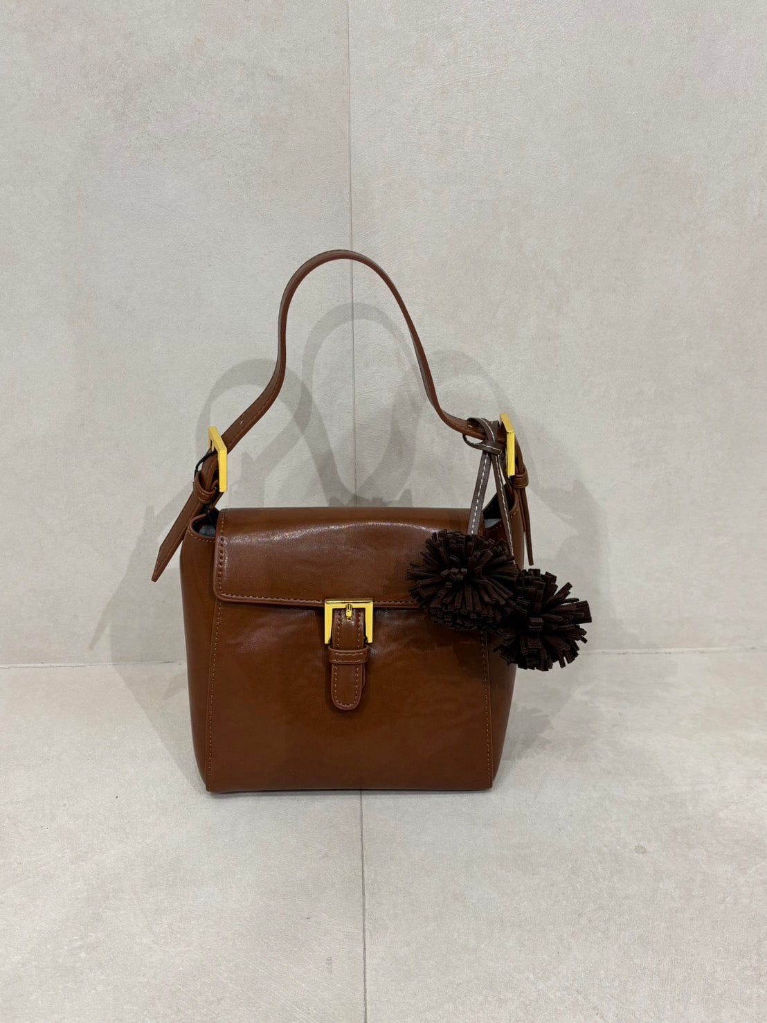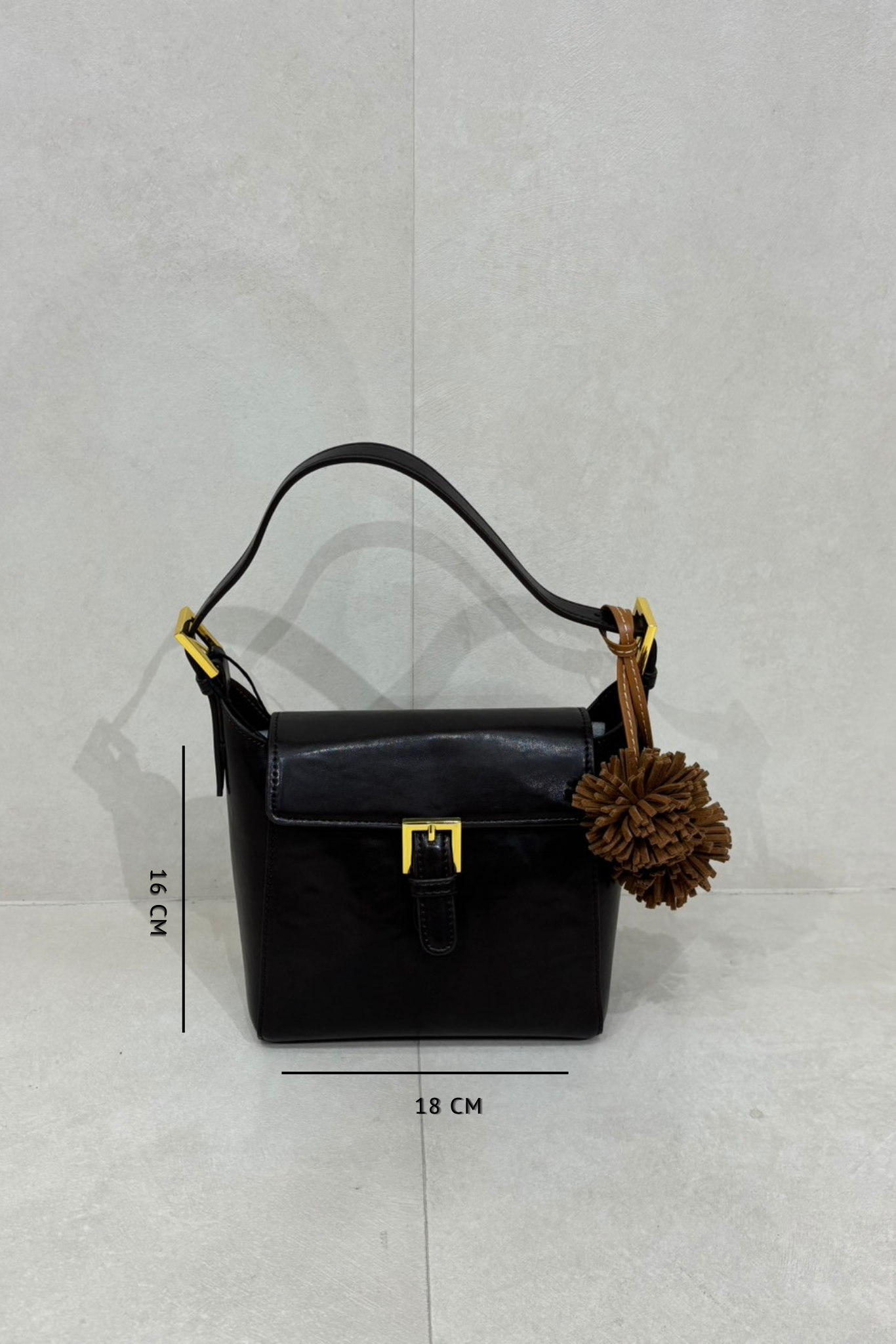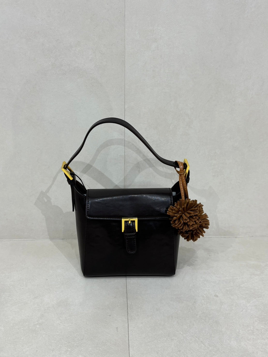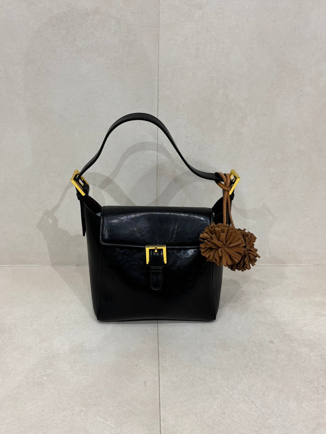 Bucket shaped shoulder bag with gold buckle.