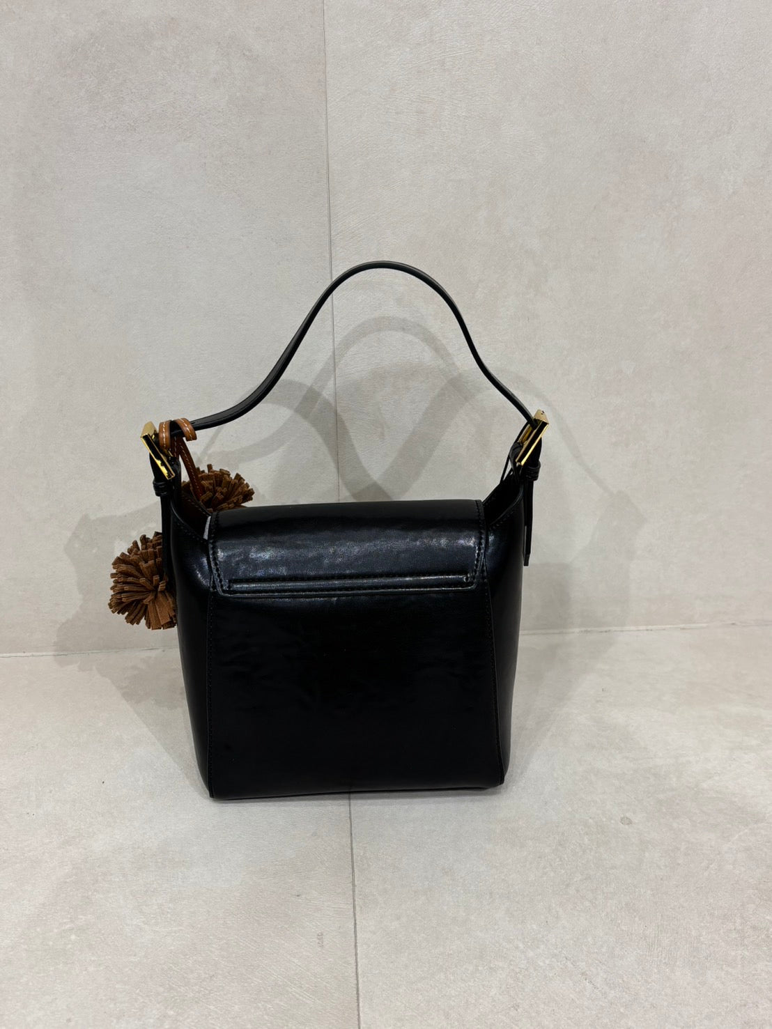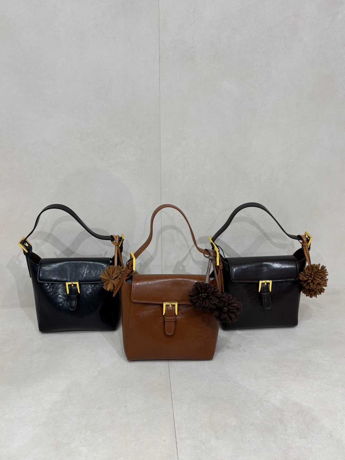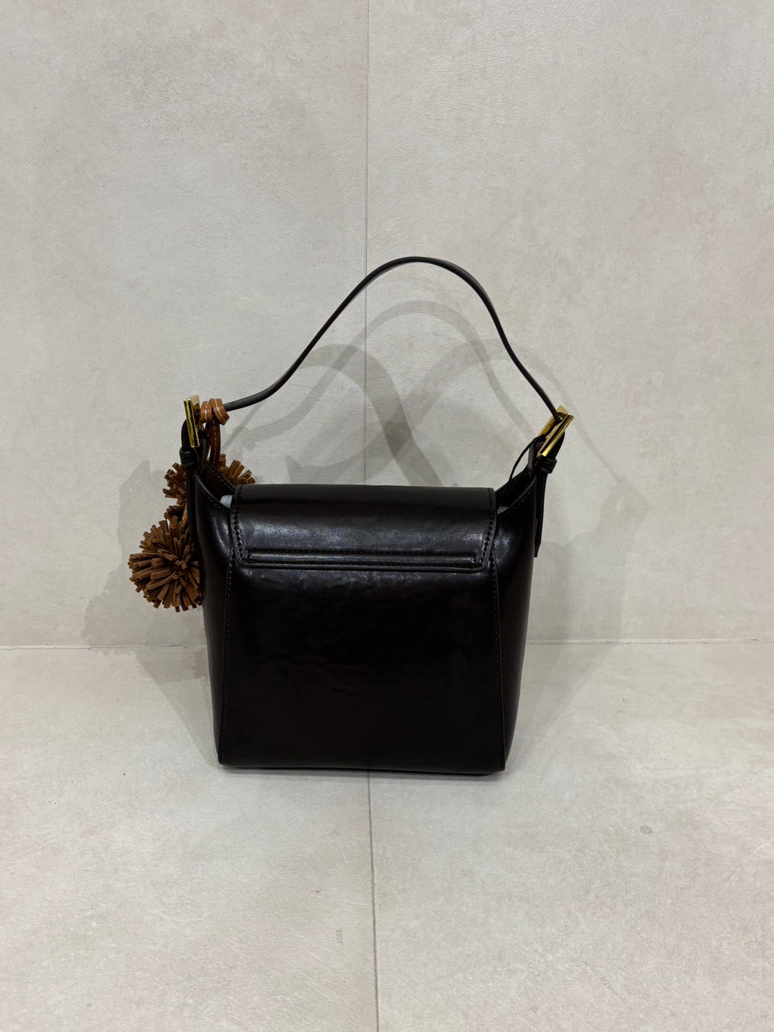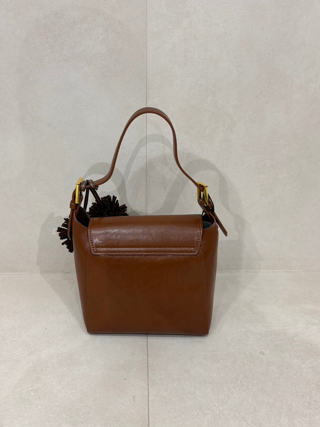 Bucket shaped shoulder bag with gold buckle.
