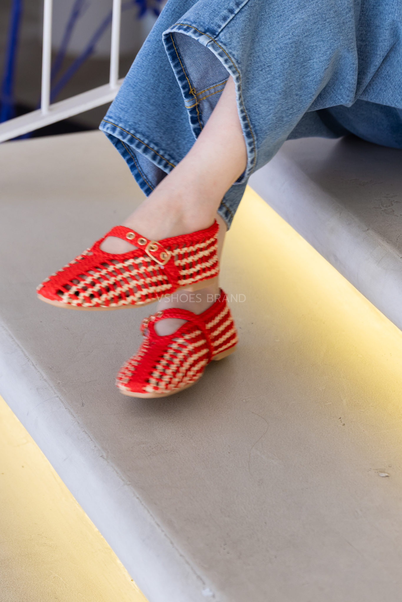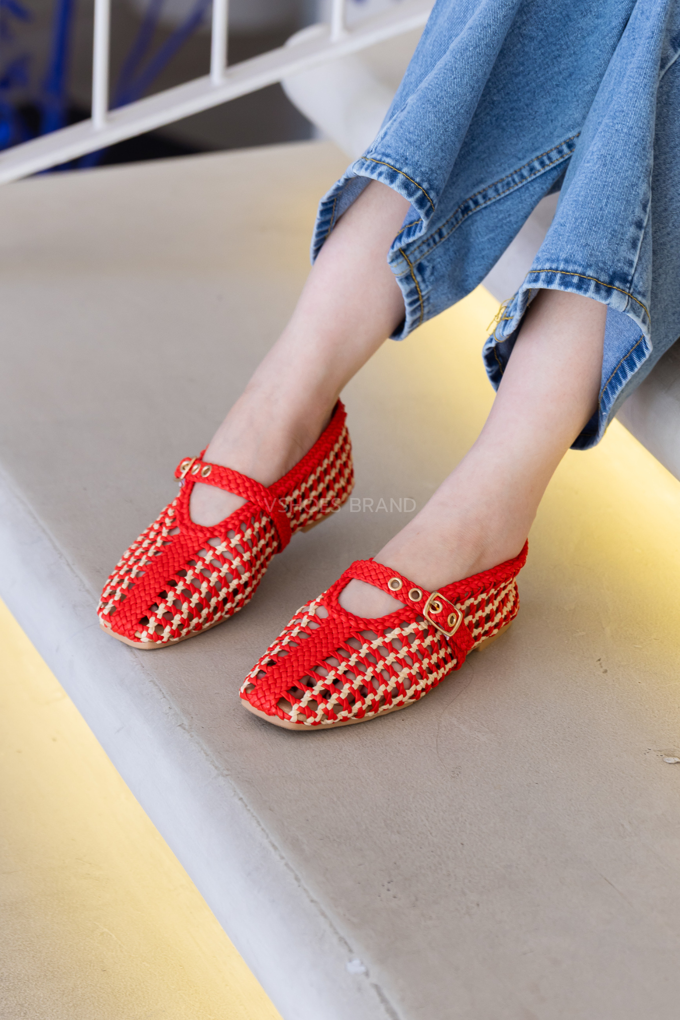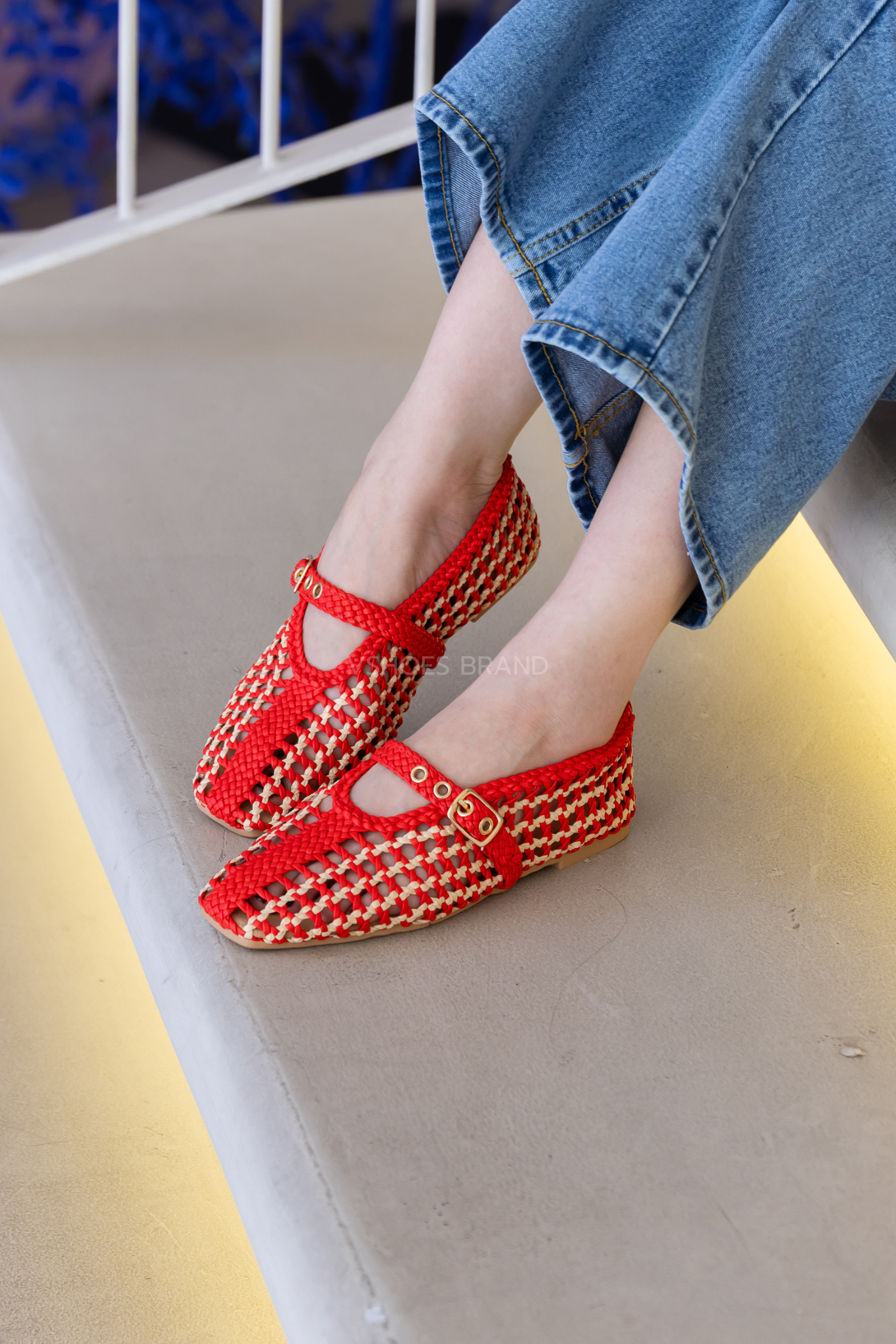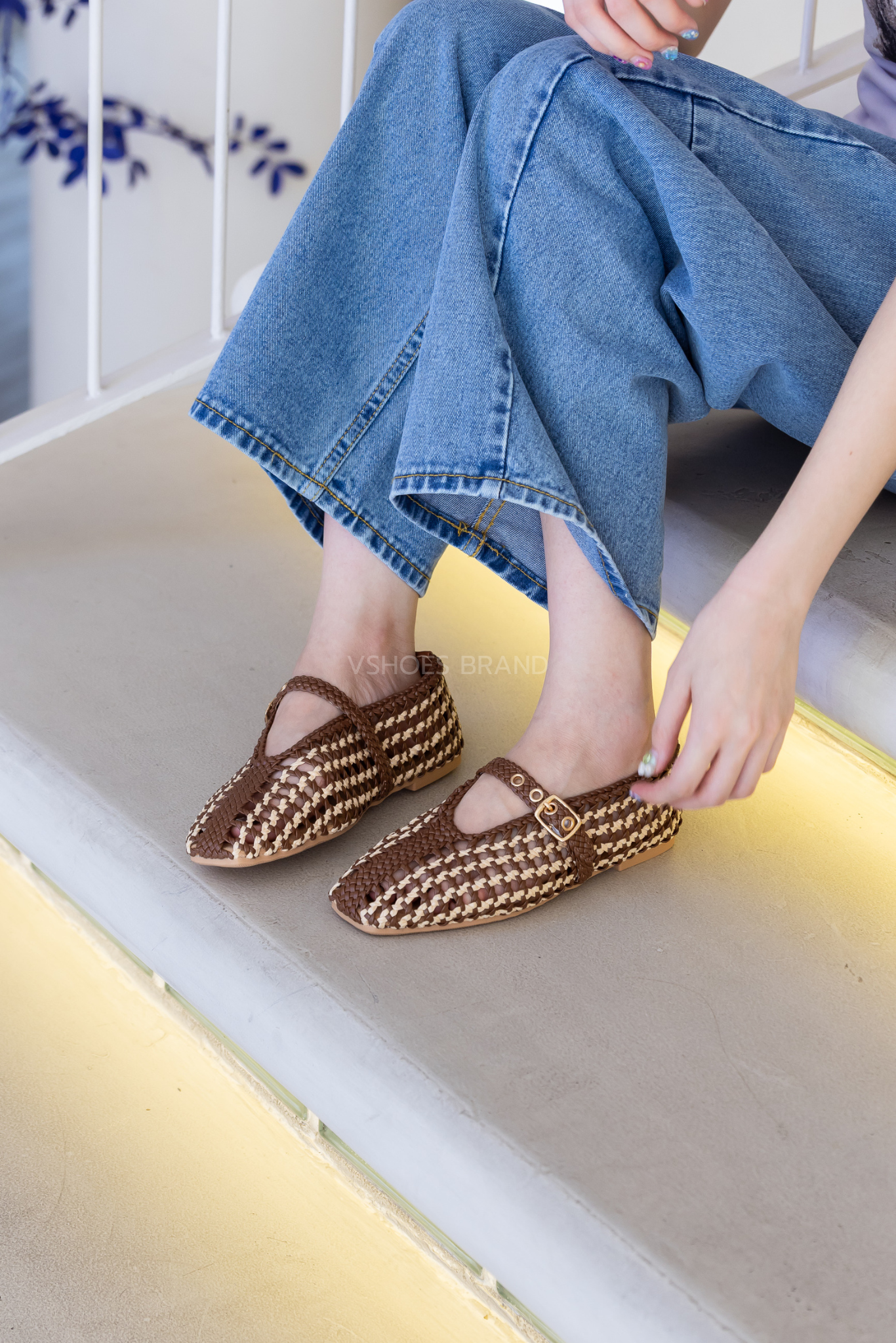รองเท้าแมรี่เจน ถักหนังไมโครไฟเบอร์ สานคาด แต่งเข็มขัด