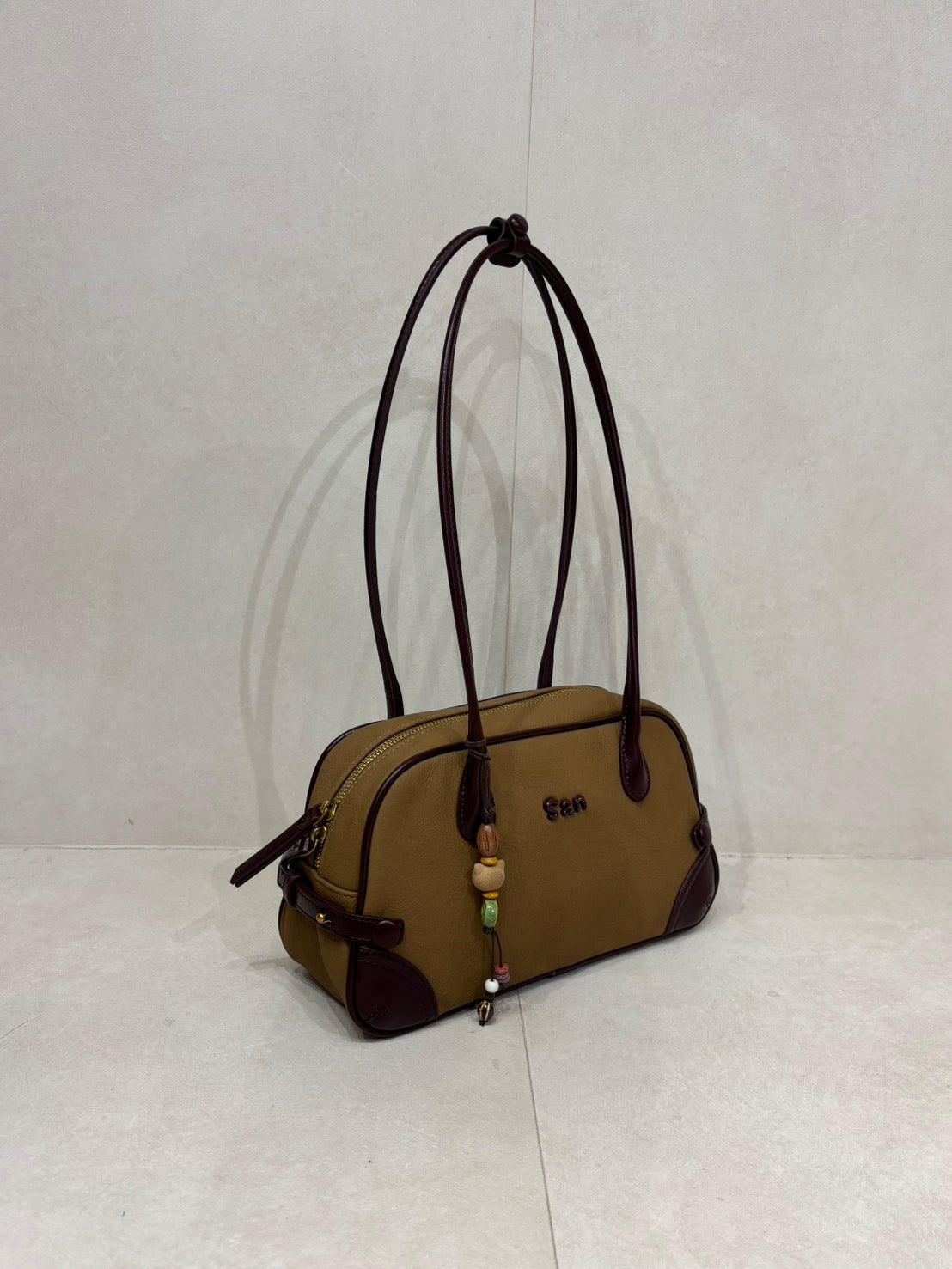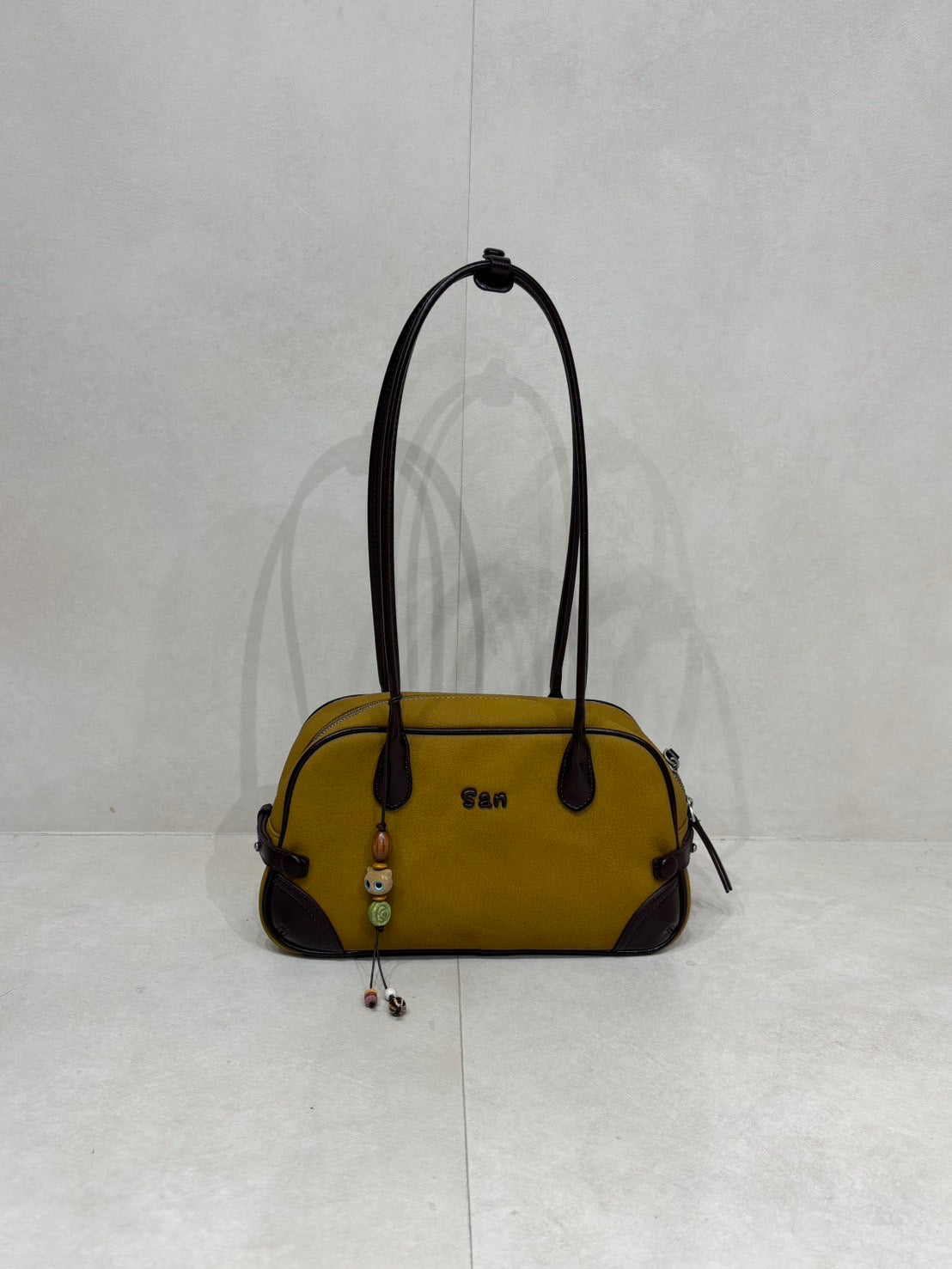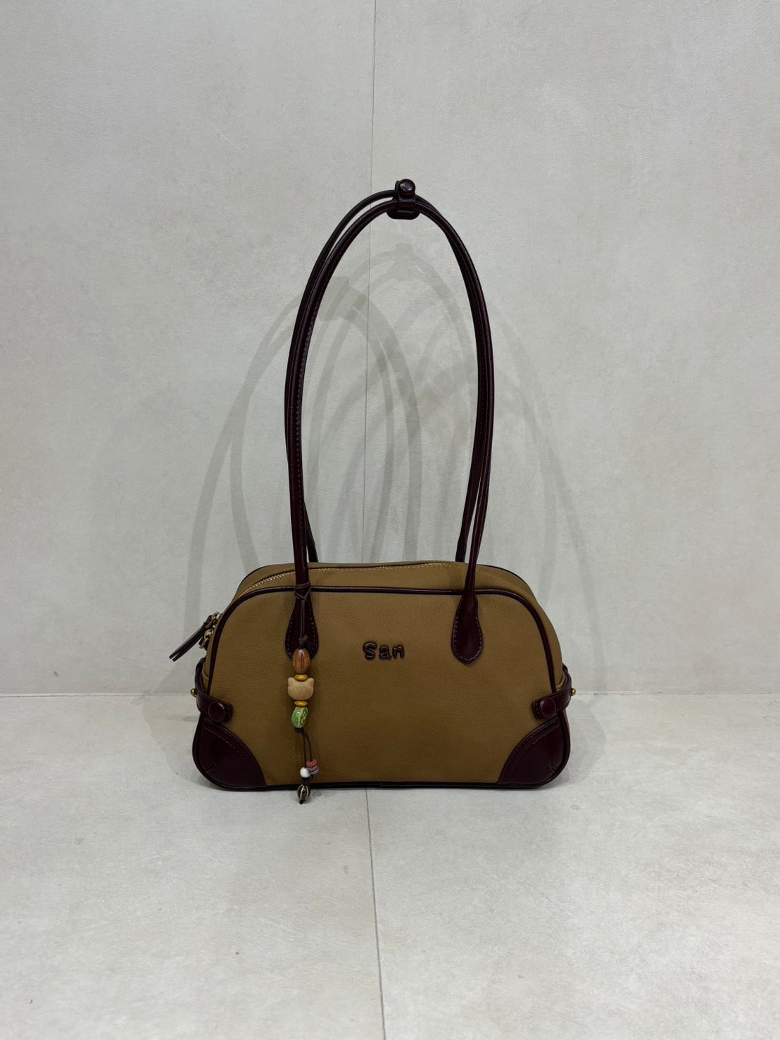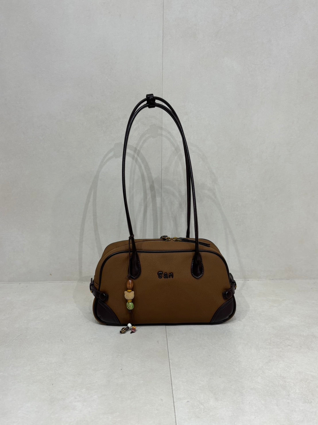 Cute and compact — Pillow-shaped shoulder bag featuring “SAN” lettering detail and a matching keychain charm.