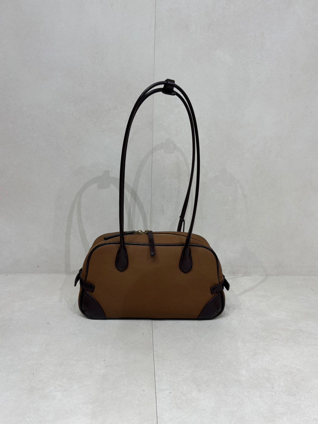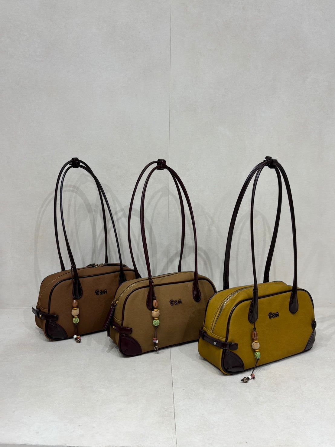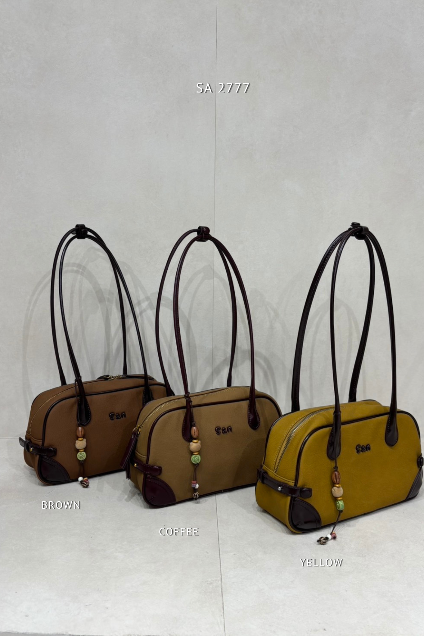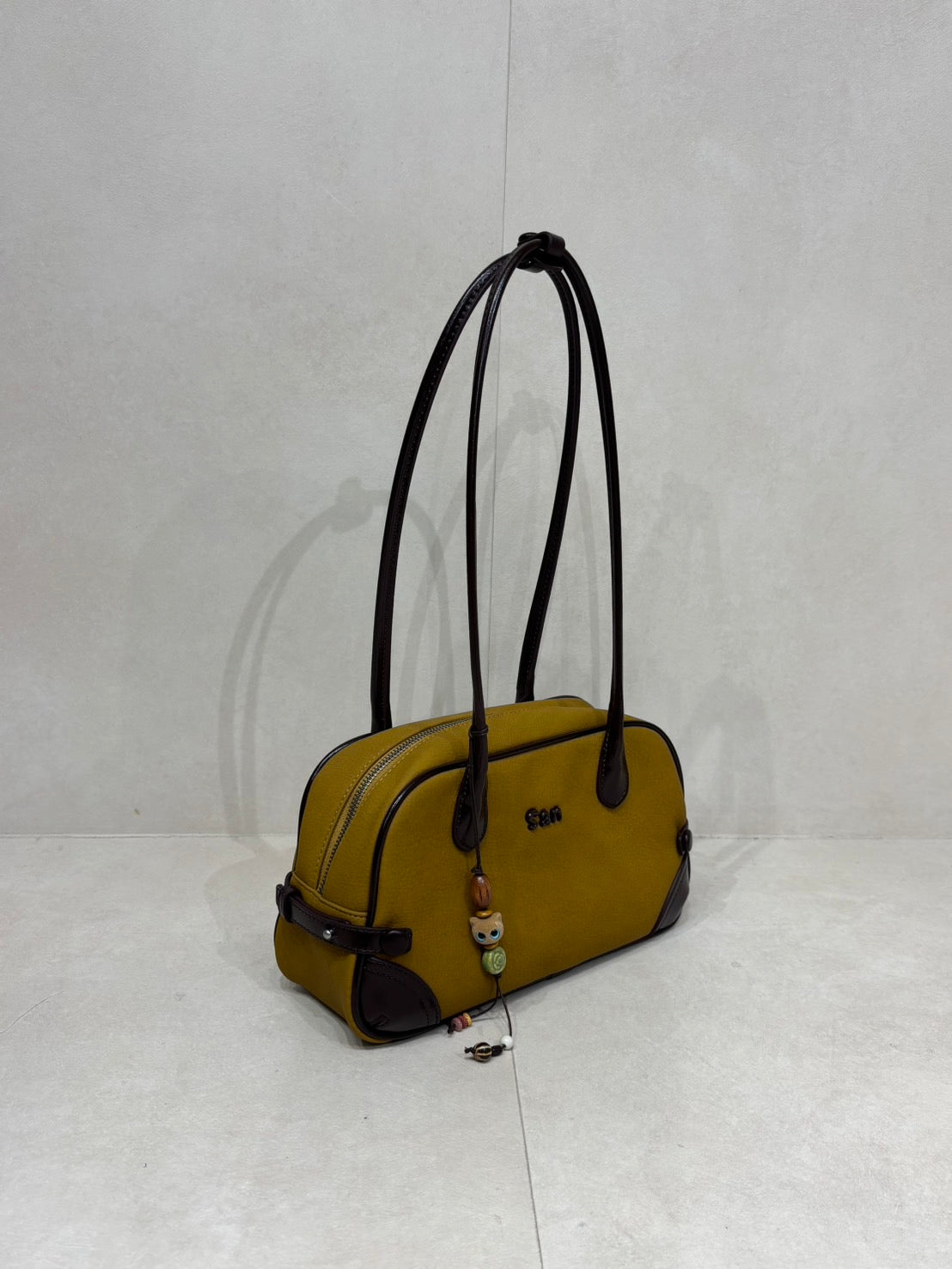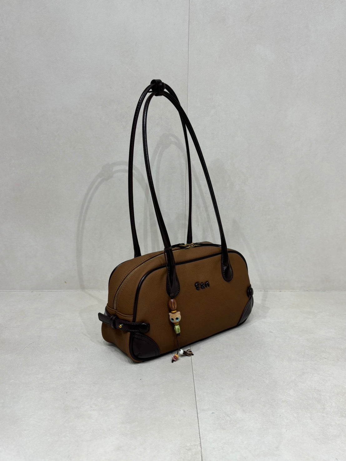 Cute and compact — Pillow-shaped shoulder bag featuring “SAN” lettering detail and a matching keychain charm.
