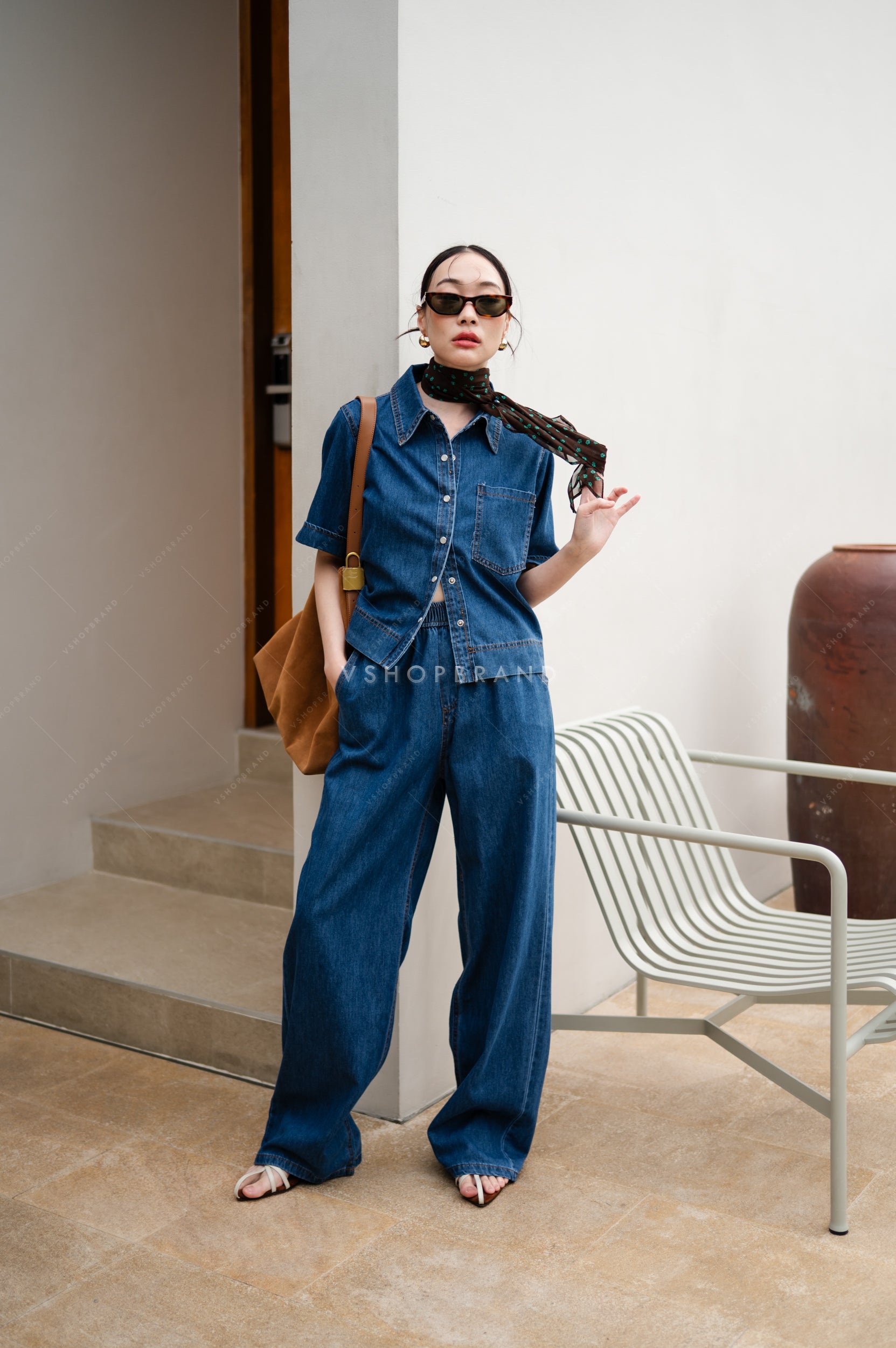 🖇️ Set: Short Sleeve Denim Shirt with Crystal Buttons + Long Pants