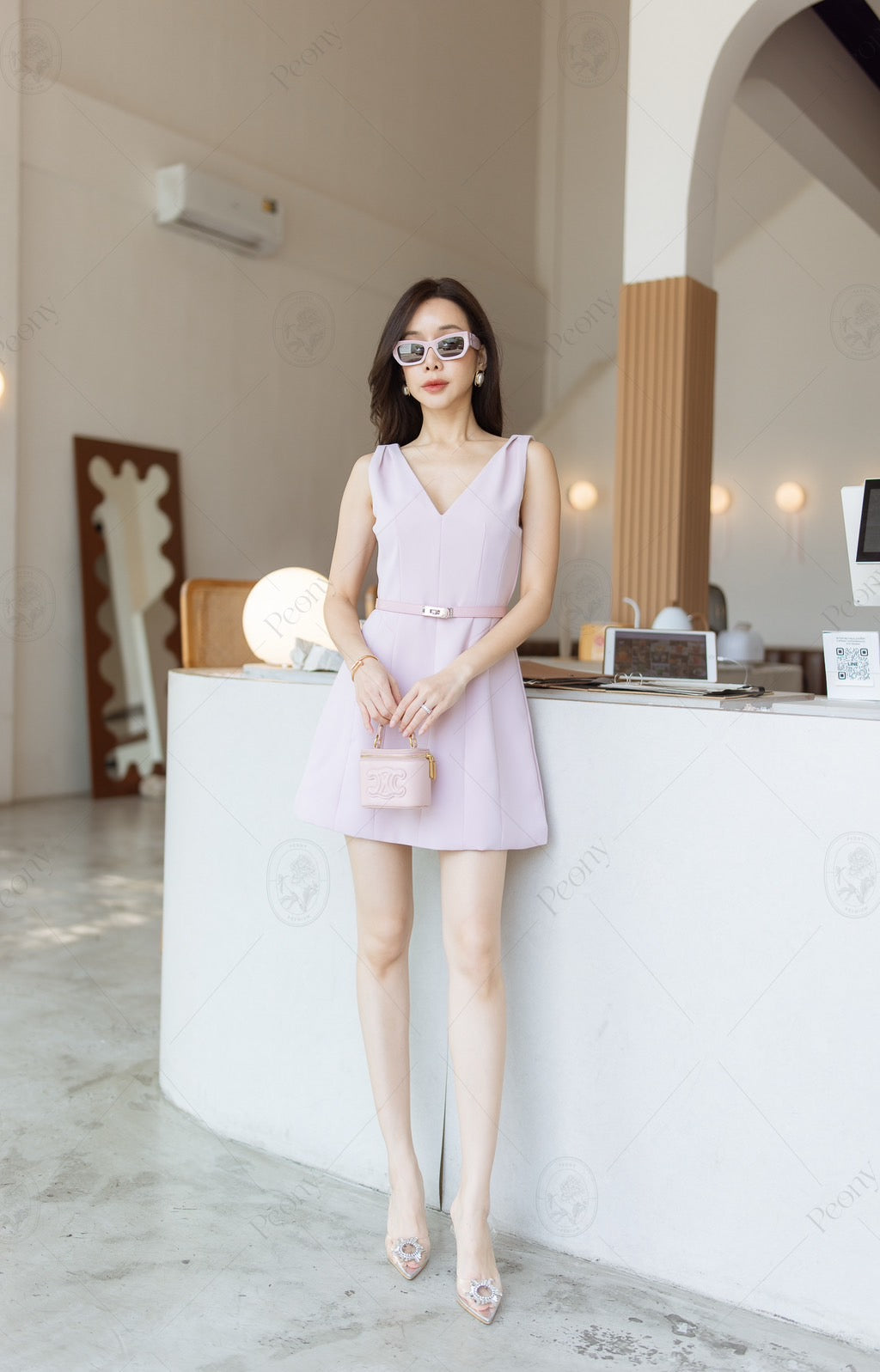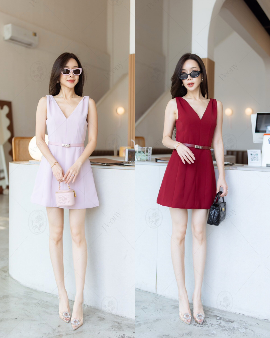 🤍 This elegant short dress crafted from premium solid fabric, showcases a sophisticated silhouette with meticulous tailoring. It features a V-neckline, delicately pleated shoulder details, and comes complete with a coordinated belt for a polished finish. The fabric is densely woven with a substantial weight, providing both structure and comfort, while the full inner lining ensures a smooth and refined fit. An ideal choice for both formal and semi-formal occasions.